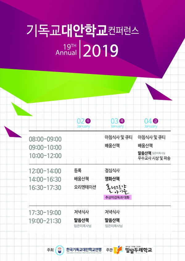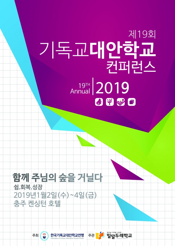 2019년도 제19회 기독교 대안학교 컨퍼런스가 2019년 1월 2일(수)~4일(금) 2박 3일의 일정으로 충주켄싱턴리조트에서 열릴 예정입니다.