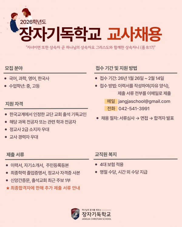 26학년도 대전 장자기독학교 교사채용공고 페이지 정보 작성자 기린 댓글 0건 조회 840회 작성일 26-01-28 11:25 본문 목록 이전글2026학년도 월광기독학교 초등과정 기간제 교사 채용 2차 공고 26.01.28 다음글[담빛학교] 중등과정 교사채용 공고 (영어) (~2/11) 26.01.27 댓글목록 댓글목록 등록된 댓글이 없습니다.